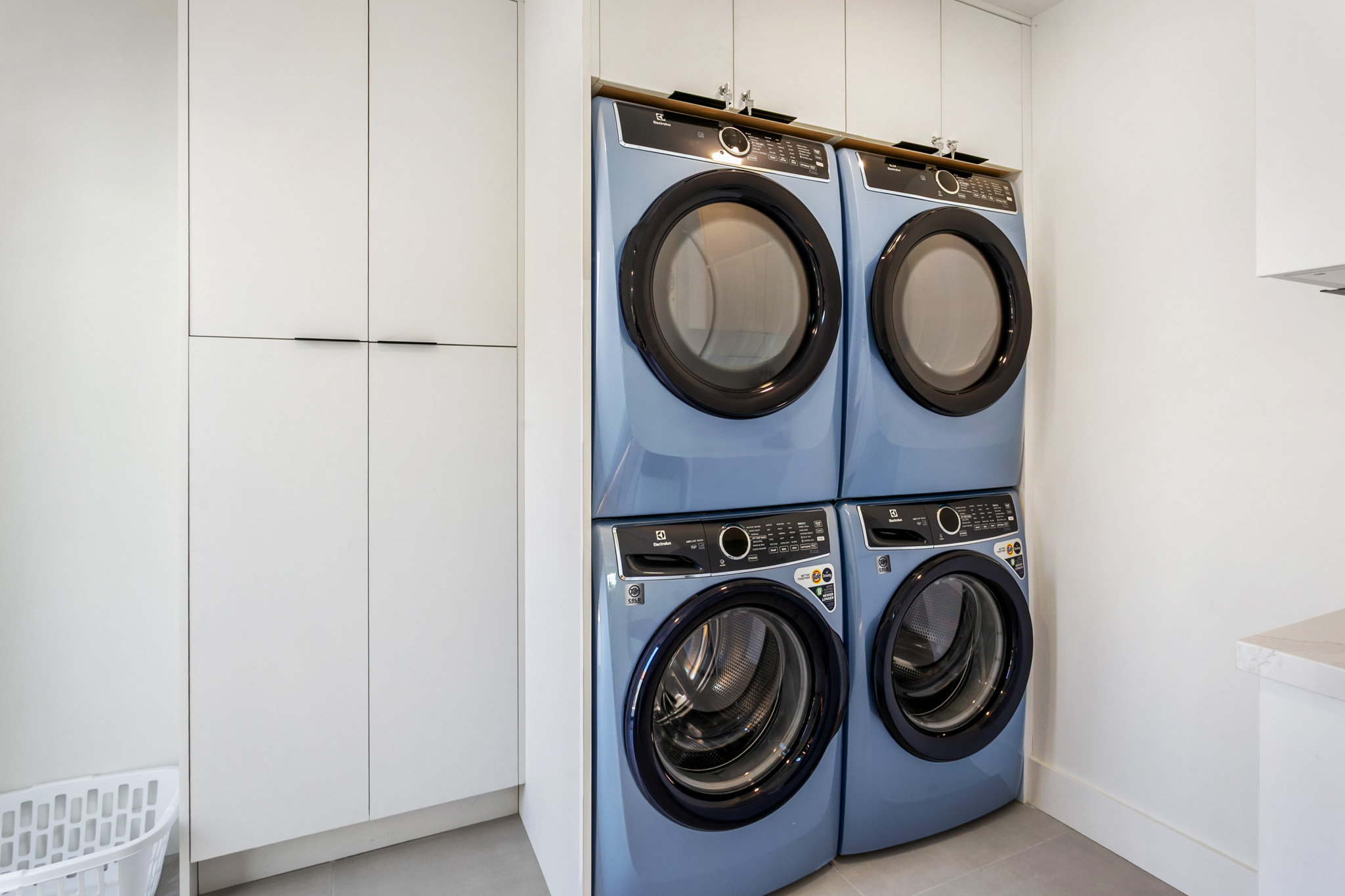 Laundry: Four washer/dryer sets, soap, iron, board