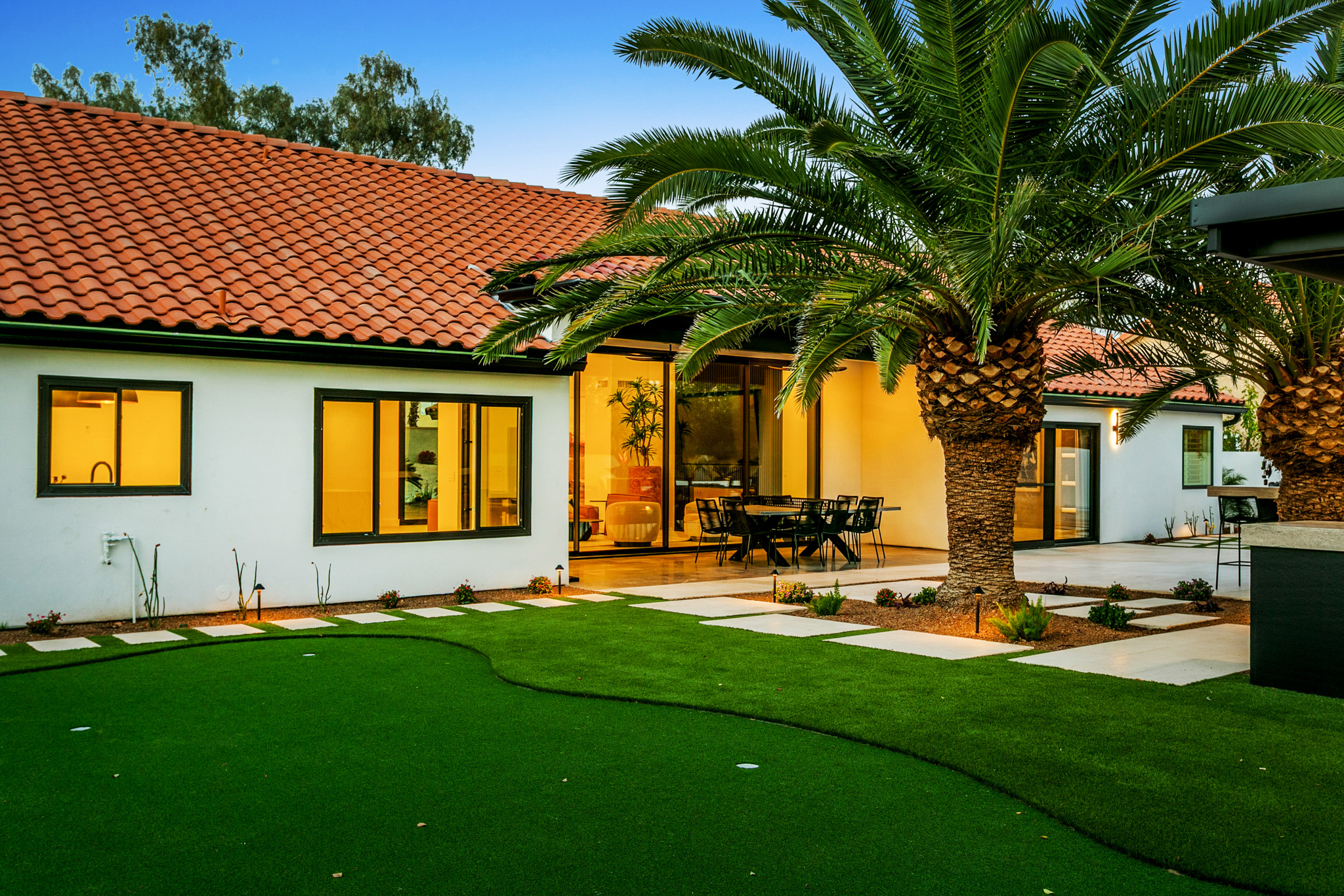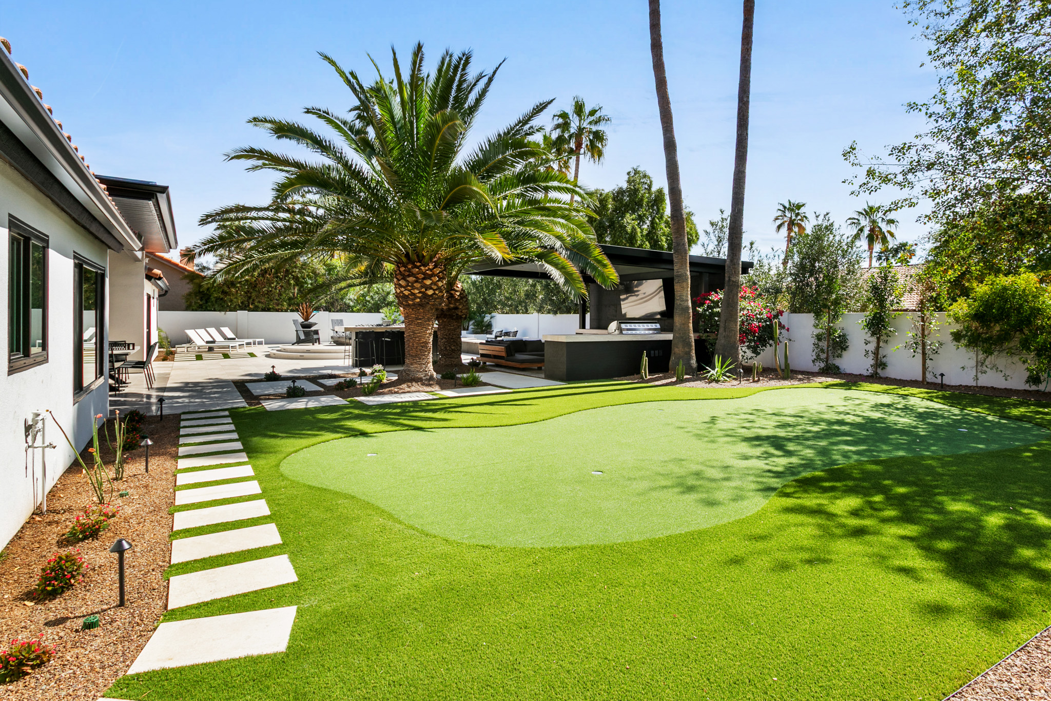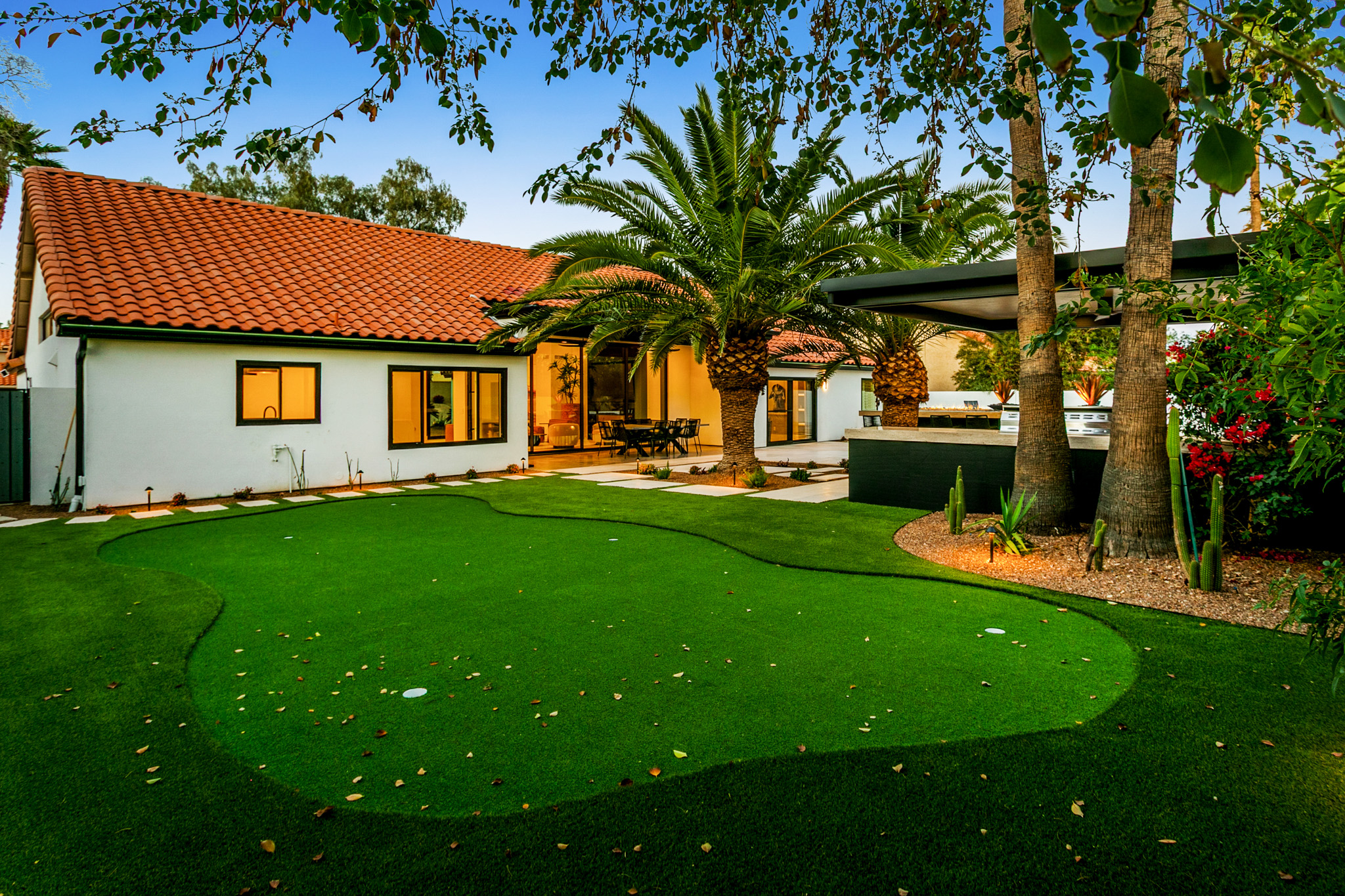 Agave Moderne' is a luxury property with designer spaces for any group to enjoy. Indoor amenities include luxury design, large designer kitchen, fun make-up station for the ladies. Large living space. Outdoor areas feature a pool and hot tub, putting green, and outdoor kitchen/bbq for relaxing evenings.