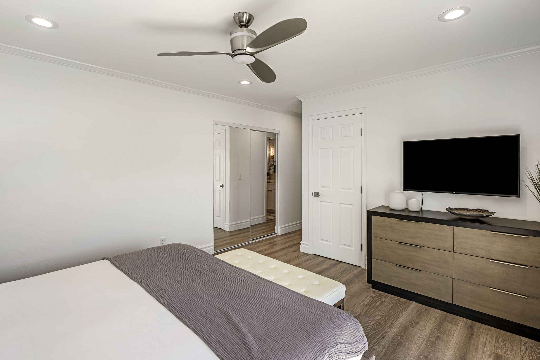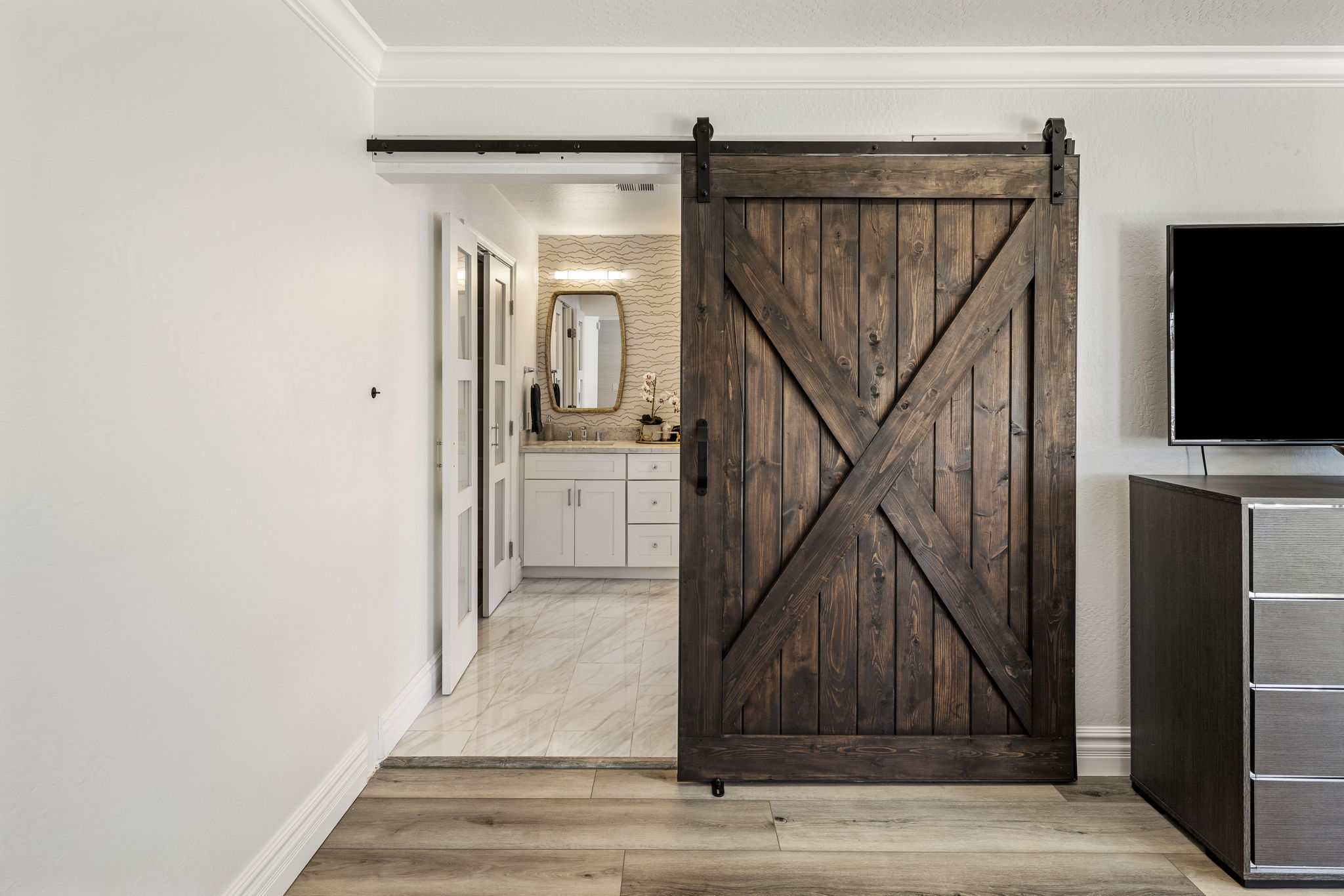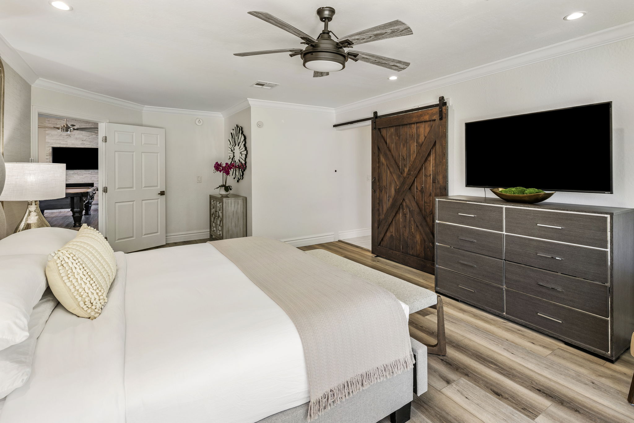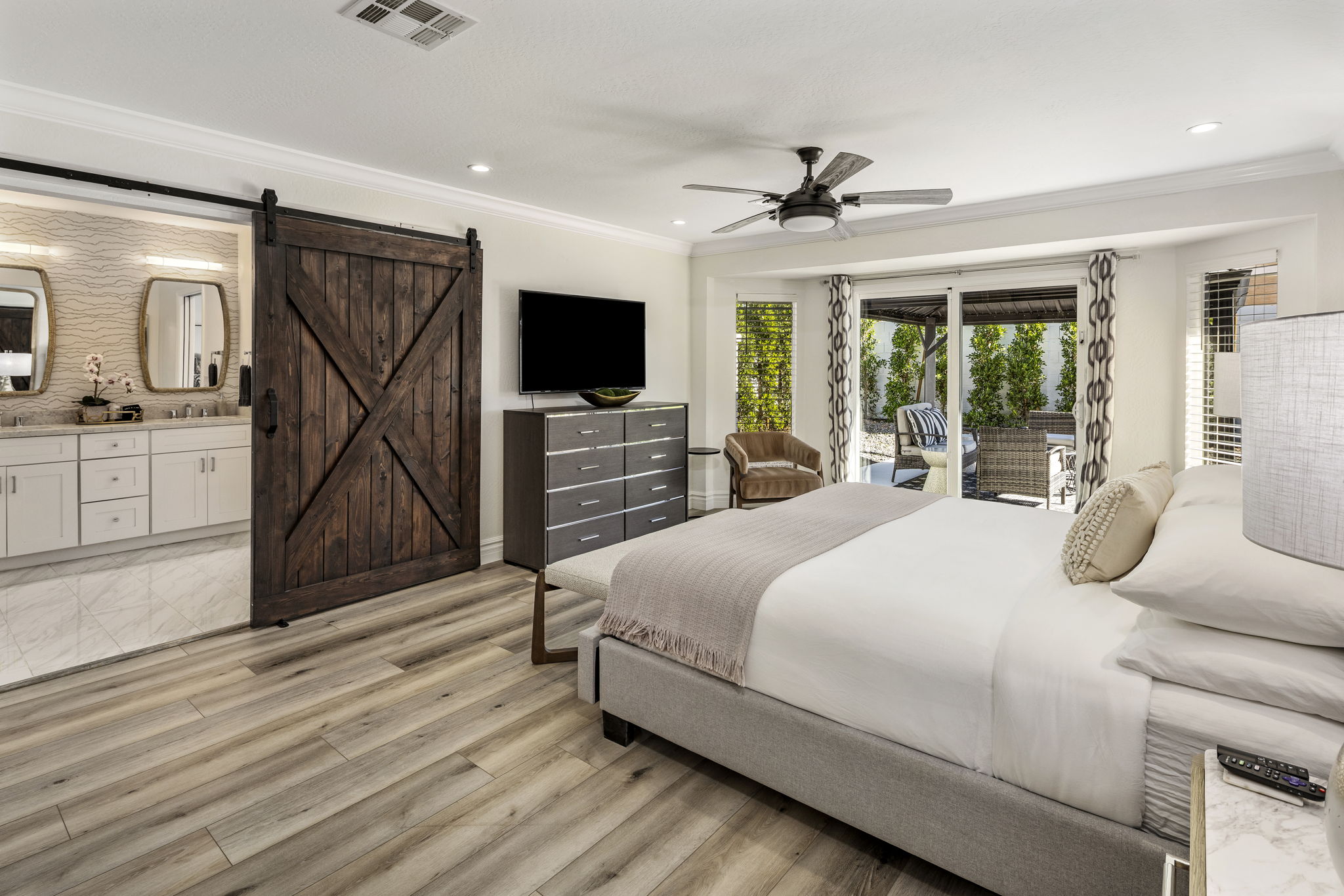 Bedroom 1 - Primary Suite - King bed, en suite with walk-in shower, double vanities, soaking tub, walk-in closet, TV, sliding glass door access to the back patio