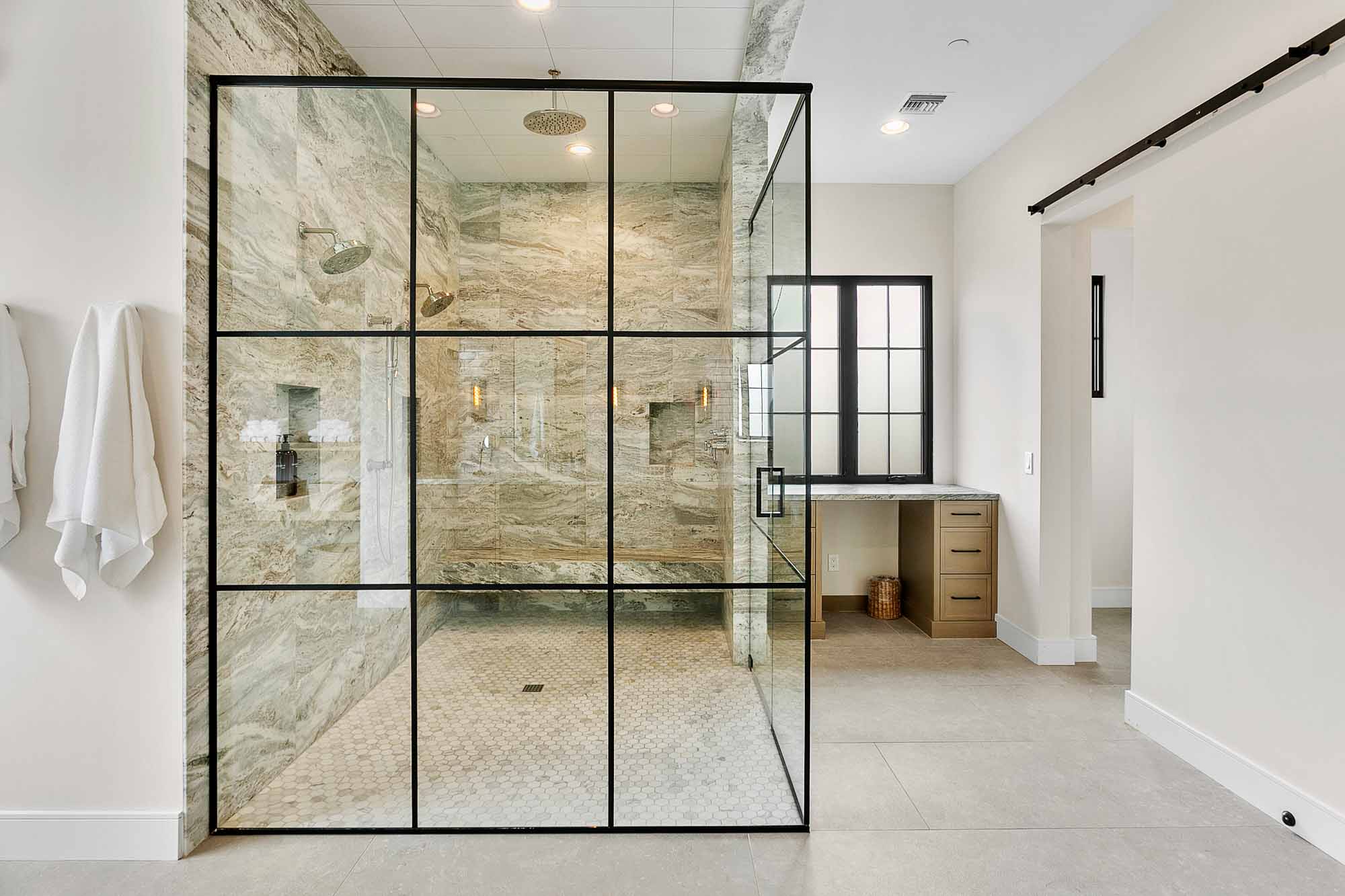 Bedroom 1 - Primary suite, king bed, fireplace, pocket doors that open to backyard, enormous en suite with walk in shower, free-standing tub, private toilet, and private urinal, double vanities, two enormous walk-in closets, smart TV, built in coffee bar, makeup vanity